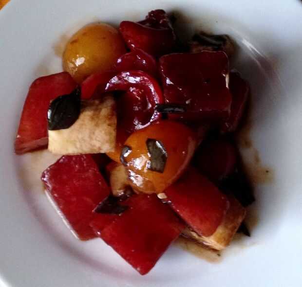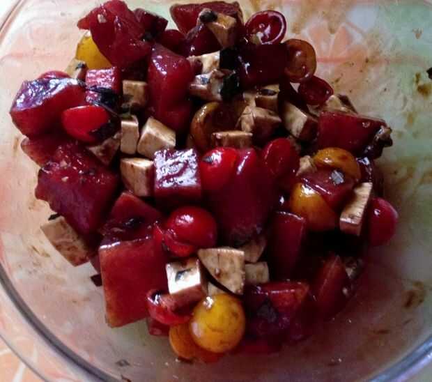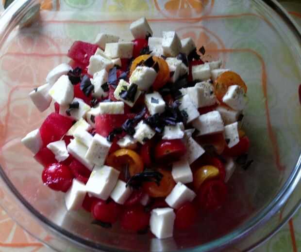 Lugar de sandía, tomate y albahaca en un bol grande, añadan aceite, glaseado de balsámico y sal y pimienta a gusto, simplemente no gusto demasiado o te comes el plato entero! Mezclar bien y servir.