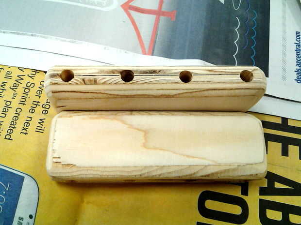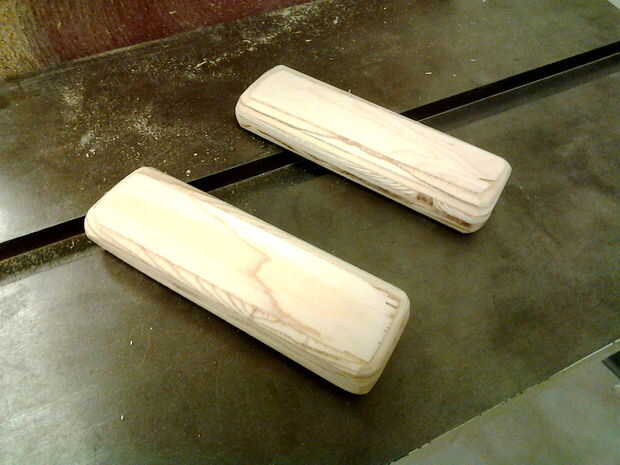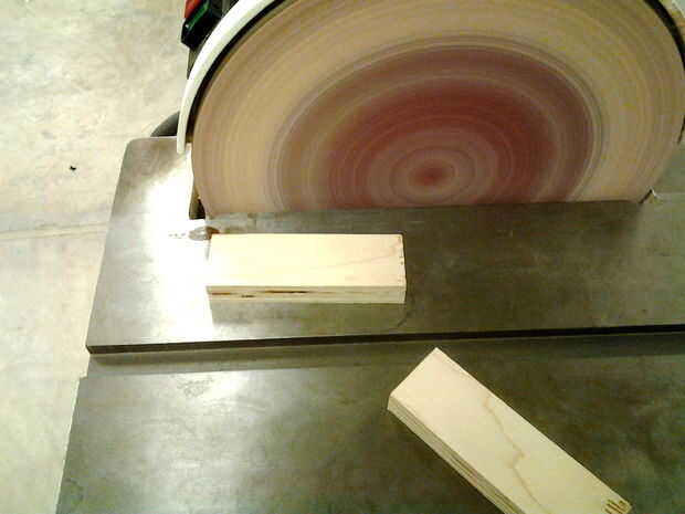 Así que corte dos pedazos de madera contrachapada de 3/4" aproximadamente 1 1/2" por 4 1/2"(4cm x 11.5 cm). Entonces yo sólo redondea las esquinas en la lijadora de disco. Usted podría apenas como fácilmente hacer esto con una dremel o una escofina a mano si no tienes acceso a una tienda de madera.