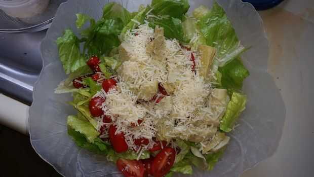 ensalada de pollo y César todo en unoPaso 1: ingredientes -Pollo rebanado (empapado en salsa italiana y a la parrilla)-Tomates picados-Lechuga picada-Cebolla picada-Tiras de queso cheddar (o cualquier tipo de queso)-Aderezo de Caesar (usé Steak House