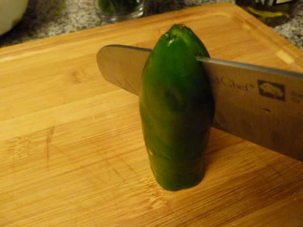 Quisiera por lo general cosas muy picantes, pero para esta ensalada, no quiero la especia a los grandes sabores de la palta y el dulzor de los tomates, así que corte las semillas y membranas hacia fuera.