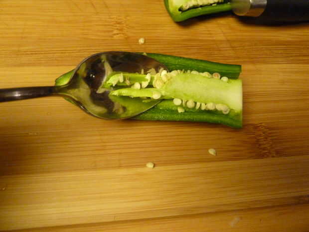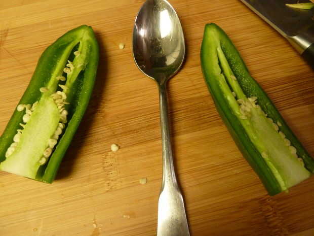 Ahora esto es importante! Con una cuchara o las manos enguantadas, sacar la membrana y semillas hacia fuera. Tenga cuidado de no tocar demasiado las tripas de la pimienta, y si lo hace, lávese las manos minuciosamente. No insisto en eso lo suficiente. (sin embargo, incluso entonces, a veces eso no ayuda. Tocó, lavar mis manos, comió la cena, que se procedió a lavar los platos más tarde esa noche... y cuando me fui a dormir unas 4 horas más tarde, rasguñó mi ojo y comenzó ardiente como el infierno Santo...)