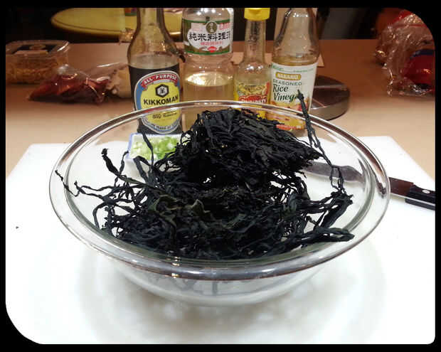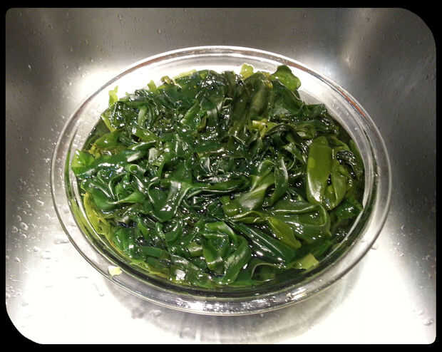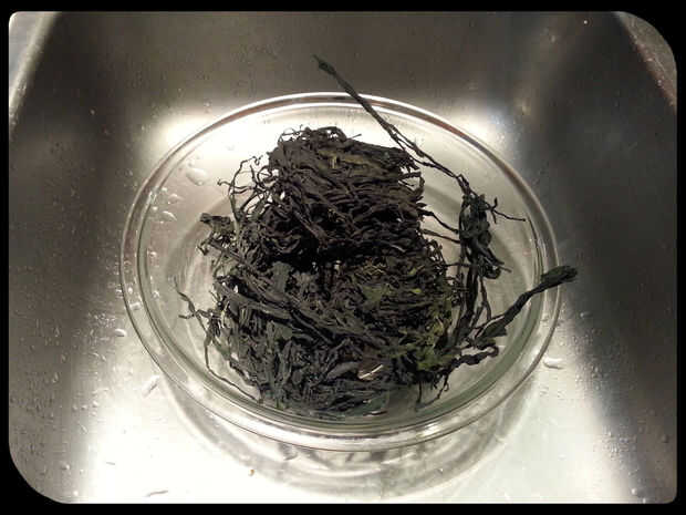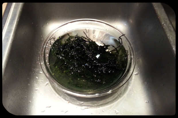 En un bol, remojar y enjuagar las algas con agua fría durante unos 5 minutos, apretando y tirando de él aparte. Como se puede ver en las fotos, se aumentan considerablemente de tamaño y comienzan a parecerse a alga marina real.