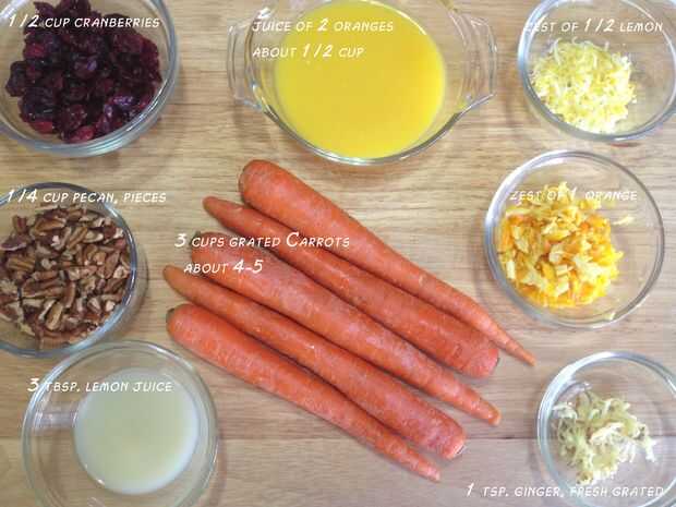 1/4 taza nuez, piezas 3 tazas de zanahorias, en gris 1/2 taza de arándanos, secados 4 tazas de agua hirviendo Ralladura y jugo de 1/2 limón Jugo de 2 naranjas Ralladura de 1 naranja 1 cucharadita ralladura de jengibre fresco