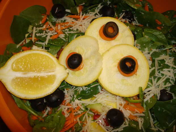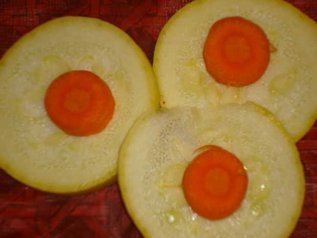 Lugar 3 rondas de squash en el centro con las aceitunas en la parte superior.