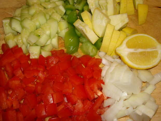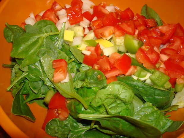 Combinar todos los ingredientes de la ensalada y el queso (reservando 1/2 lata de aceitunas para el arroz).