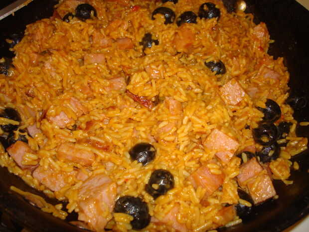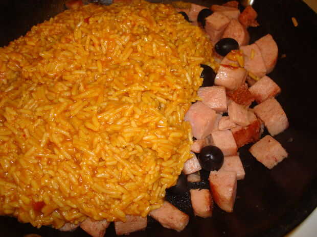 Combinar el arroz cocido y las aceitunas para el Spam de dorados.