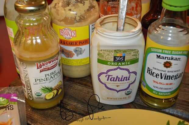 5. en un tazón pequeño combine el aceite caliente de sésamo tostado, salsa de soja, jugo de piña, vinagre de arroz, salsa de ajo de chile, semillas de sésamo, el zumo de 1 limón, el jengibre fresco y ajo.