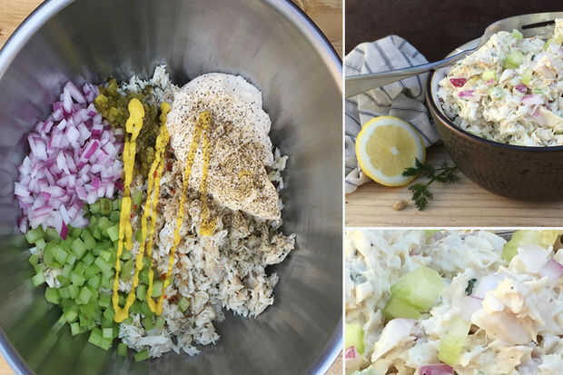 Comience con el atún preparado en un gran recipiente de acero inoxidable. Añadir 1 cada copa de martini en cuadritos cebolla roja y dados de apio. Luego 1 cada shot de vidrio Vlasic Sweet Relish y deseo italiano de hueso aderezo. Continuar agregando 5 cada cucharadas mayonesa Real de mejores alimentos y 1 cada cucharada mostaza amarilla de Heinz. Terminar con 1 cada cucharada picada de perejil italiano fresco, 1 cada cucharadita McCormick puro de pimienta negra molida y 1/2 cada cucharadita de Sal Kosher de Morton. Con una cuchara grande para servir mezcle el contenido hasta que esté mezclado uniforme.