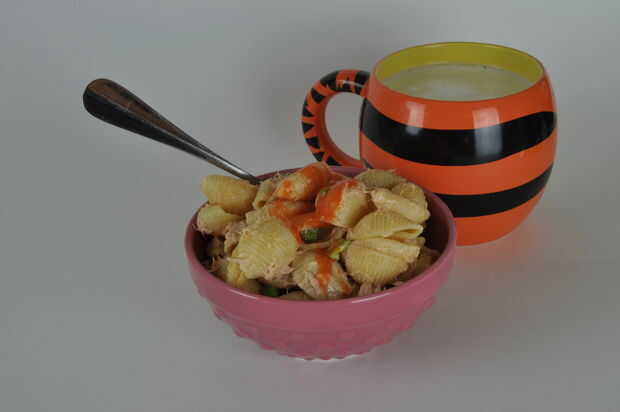 es 105 fuera y no estoy comiendo nada caliente.  Se trata de un Ramen ensalada servido a temperatura ambiente o fría y es muy fácil de hacer.Paso 1: ingredientes Ramen superior 2, lata de verduras mixtas, mayo y salsaPaso 2: "cocina" fideos 2 pa