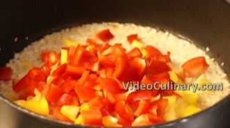 Calentar 80 gramos de aceite de oliva (u otro aceite vegetal) en una sartén de fondo gruesa. Añadir la cebolla. Freír por un minuto o dos y añadir los pimientos.
