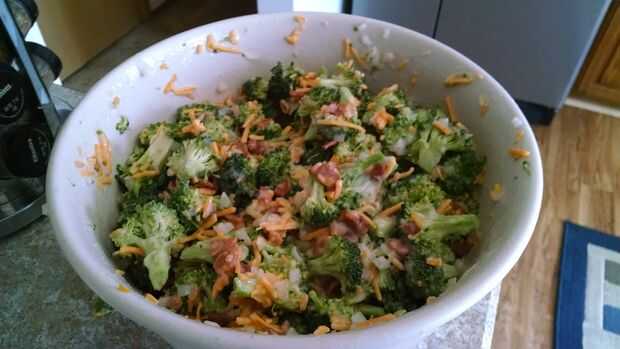 esta es una receta fácil para hacer la mejor ensalada de brócoli nunca!!!!!!Paso 1: 1. Ingredientes necesariosFlowerettes de Broccolie de 4-5 tazas1/2 taza cebolla roja, en rodajas1/2 taza de queso Cheddar rallado1/2 lb de tocino, frito y picadoAdere