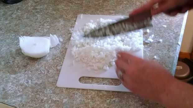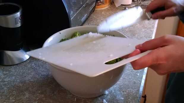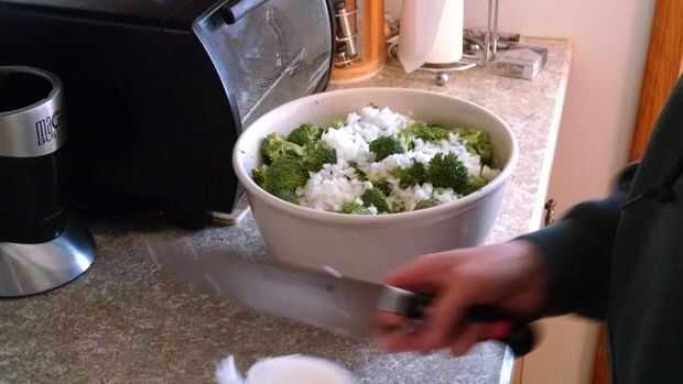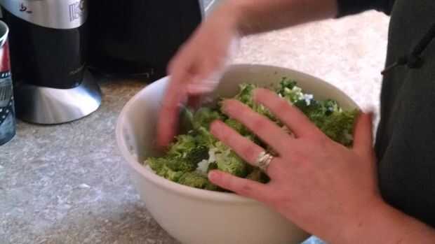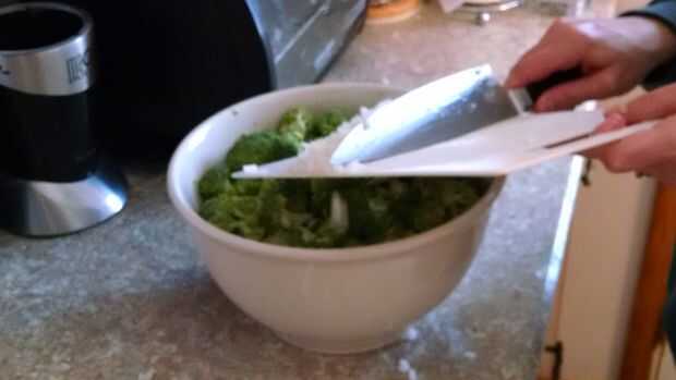 Pelar la cebolla y corte en la puntuación de la mitad cada mitad sobre una rejilla de 1/4 de pulgada. Empezar a rebanar la cebolla, sus puntuaciones creará pequeños pedazos. Una vez hecho rebanar y cortar en cubitos, desecho de la cebolla en el tazón de brócoli. Mezclar el brócoli y la cebolla junto con las manos.