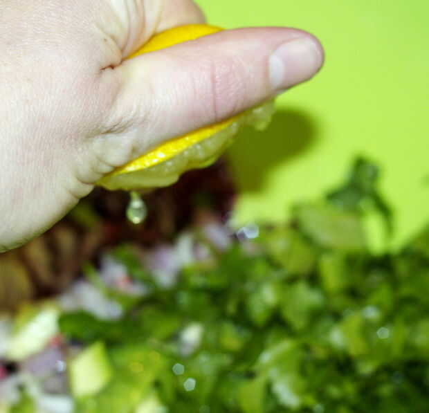 Ajustar los condimentos, añadir más sal, pimienta y jugo de limón si es necesario. Un poco de néctar de agave o miel (~ 1 cucharadita) tomará el borde del limón y mezclar muy bien los sabores.
