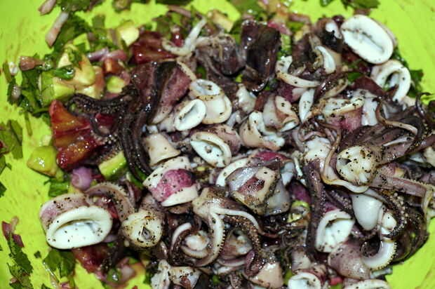 Mezcle nuevamente para distribuir los jugos. Dejar la ensalada de marinar en la nevera un poco no hace daño.