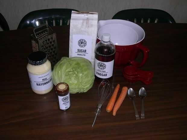 1 o 2 zanahorias, 1 1/4 tazas de mayo, 1/3 taza de azúcar, 1/4 taza de vinagre. Puede agregar otros ingredientes como pimiento verde, col lombarda, cebollas o brócoli. Condimentos adicionales se pueden agregar al gusto como seco de granos de pimienta enteras (lo que yo uso), mostaza, semillas de apio o cebolla en polvo, etc..