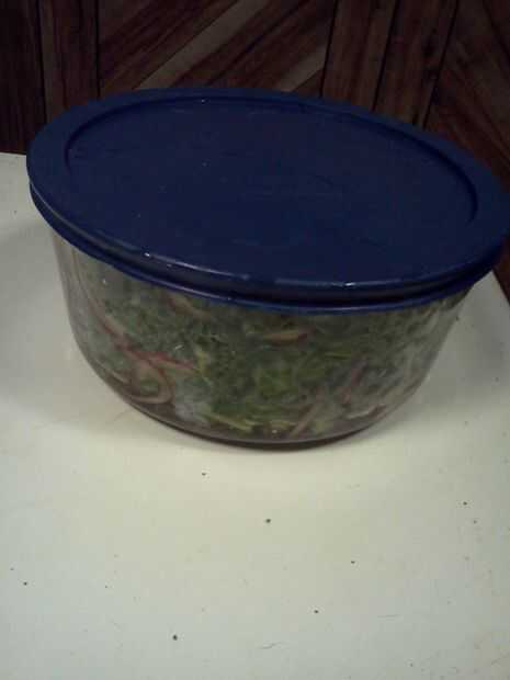 NO MEZCLE LA ENSALADA! Cubrir el recipiente con una tapa ajustada y frote suavemente la ensalada girando el recipiente boca abajo y lado derecho hacia arriba otra vez varias veces. Este proceso asegura la cebolla permanece en el fondo del recipiente y continuar a "cocinar" en mezcla líquida, mientras que la col rizada de la capa a la vez.