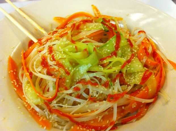 me encanta una ensalada de fideos fríos en verano, especialmente dulce y uno amargo. Pollo a la parrilla en salsa de curry rojo saca el pop de chile en la salsa dulce y picante. Un montón de verduras en juliana, aguacate y salsa de ciruela completan