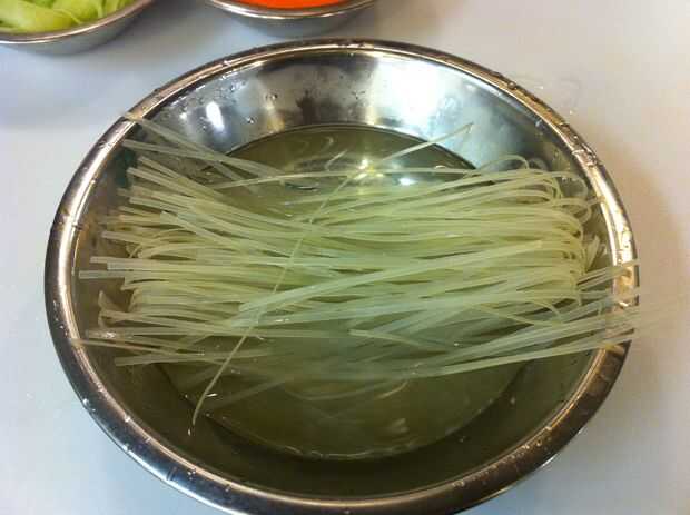 2. Lugar el arroz fideos en el agua y la dejó sentarse mientras prepara las verduras.