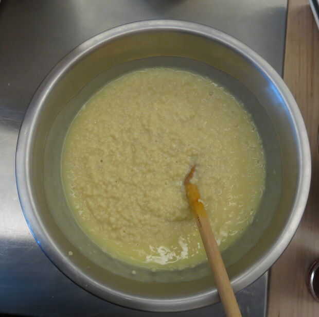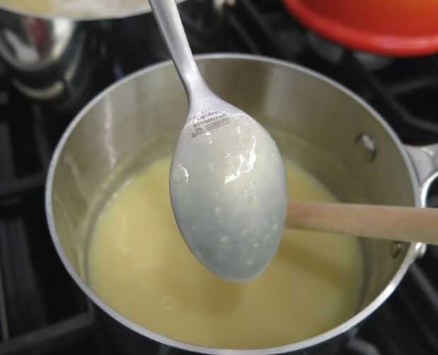 En una cacerola, combinar jugo de azúcar, sal, huevos, harina y piña (tomado de la lata de piña, trozos de piña de la tienda en la nevera hasta que se necesite más adelante). Cocinar a fuego medio hasta que espese (cuando se pega a la parte posterior de la cuchara debe ser lo suficientemente gruesa). Revolver continuamente para que no se queme.