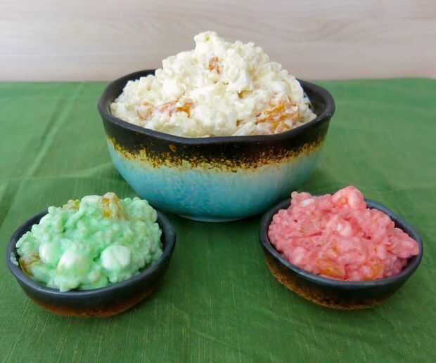 la primera vez que comí esta ensalada fue hace 36 años mientras vivía en Florida. Asistí a un almuerzo y esta ensalada se sirve. Me fui en busca de su creador averiguar qué además, piña, mandarina y malvaviscos, estaba en él. Aprendí que el ingredi