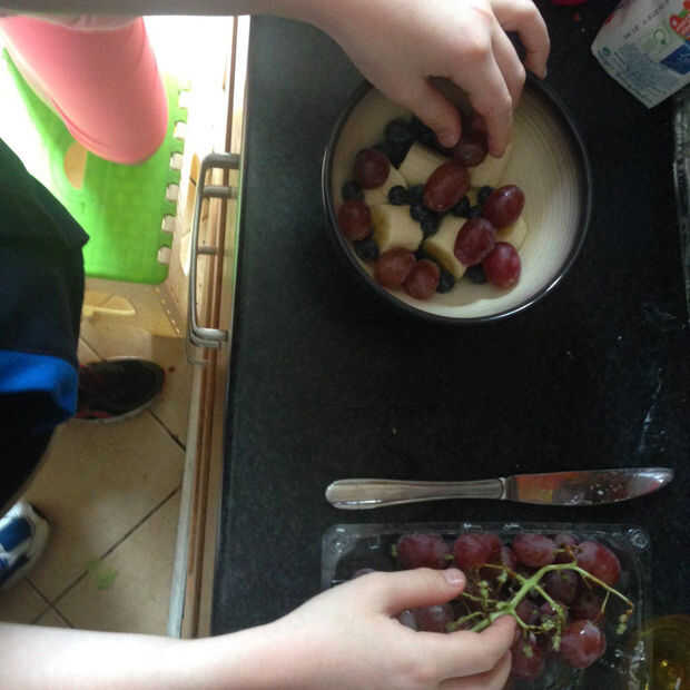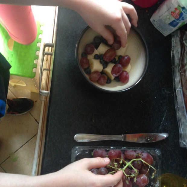 Paso 2: Agregar los arándanos, plátanos, fresas y uvas