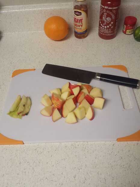 Nota : Cortar la manzana en cuartos, luego cortar las piezas en cuartos otra vez. Sin embargo, usted puede cortar cualquier forma que le guste.