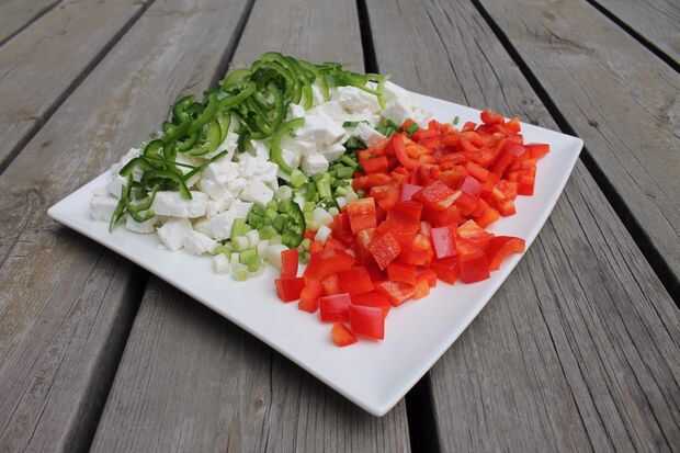 Cortar las verduras y el queso en trocitos tamaño bocado.