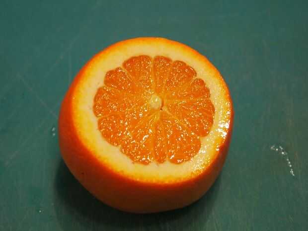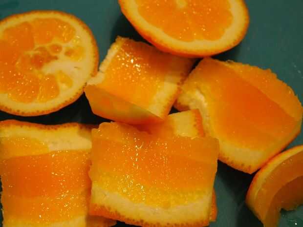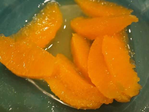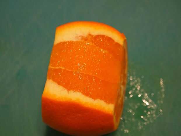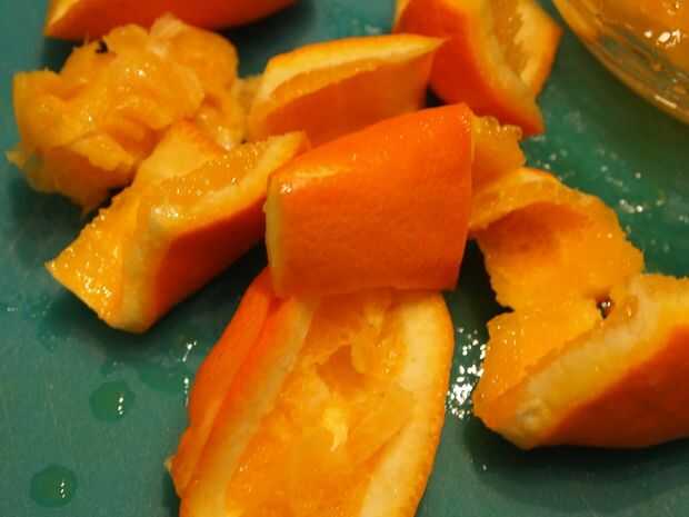 Guardar las piezas que usted corta; exprimir el jugo de ellos en el recipiente con las naranjas.