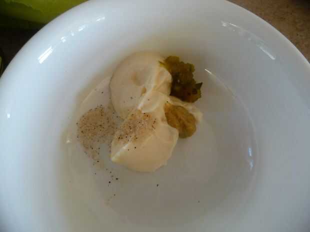 - Guarnición - rodajas de cebollas verdes y cuña de acelgas en escabeche