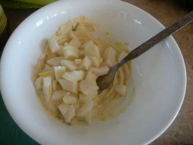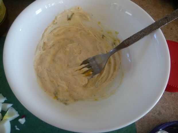Pelar los huevos y separar las yemas y las claras. Manteniéndolos separados, picar (no puré) las yemas de huevo y las claras de huevo.