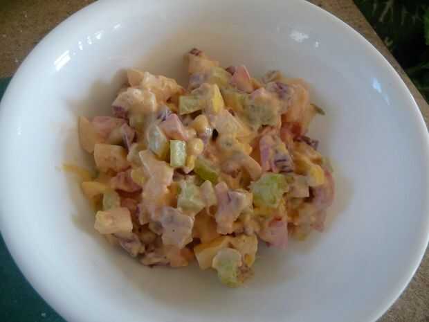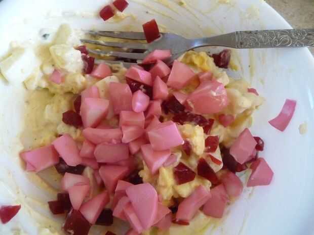 Combinar mayonesa, mostaza, apio, remolacha en cubos, salsa de pepinillo y sal/pimienta en un tazón y revuelva.