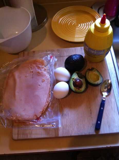 Esto es lo que necesita para servir 2: 1 aguacate, 2 huevos duros (picados), 3 rebanadas de carne de deli sin conservantes (me gusta Turquía), Paleo de 1 cucharada mayonesa, 1 cucharada de mostaza