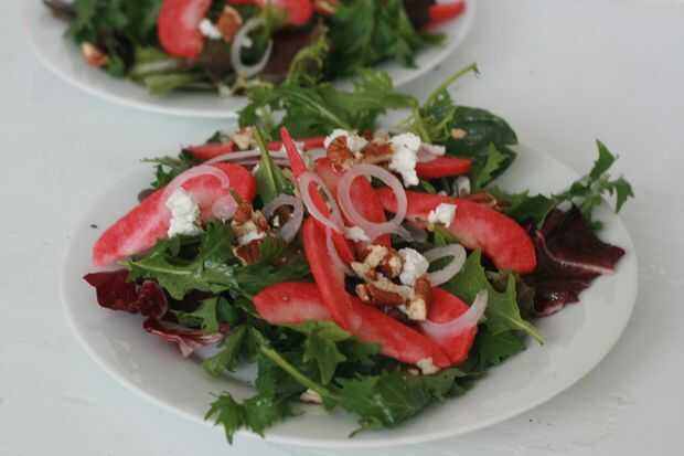 Manzanas color rosa son muy agrio y dan un brillo real a esta ensalada (ambos visualmente y tasteually - bastante seguro de que es una palabra). Si usted puede encontrarlos en su mercado local, es un perro afortunado. Probar esta ensalada esta noche!