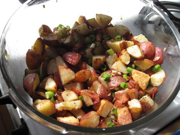 crecí en un hogar de muy anti-mayonesa y ensalada nunca tocaría hasta que comencé a comer el tipo libre de mayo en el Oktoberfest en el club alemán local. Ensalada de papa alemana caliente "hot" o al menos muy caliente y lleno de bondad de tocin