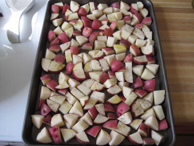 Una vez que están cortadas, ponerlas en la bandeja y sazone generosamente con sal y pimienta. Luego, rociar en un poco de aceite de oliva y lanzarlas por lo que son todas un poco brillante.