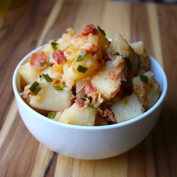 Ensalada de papa alemana es grande caliente o frío y es muy fácil de tirar juntos. Estoy usando la receta de la alegría de cocinar, pero un poco alterado por lo que es más como mi abuela. Su ensalada de papa alemana tenía semillas de mostaza entera y sin apio, por lo es la manera de hacerlo también.