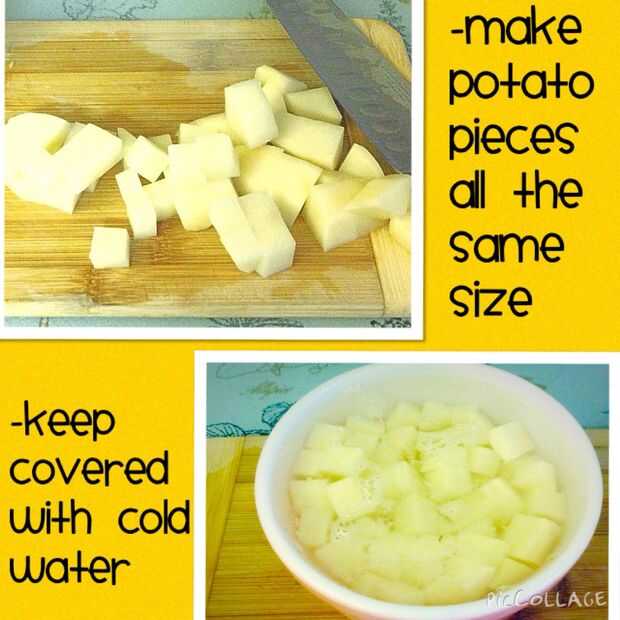 Al cortar las patatas, mantenga las piezas todas del mismo tamaño para una cocción uniforme. Pedazos pequeños se cocinan más rápido.