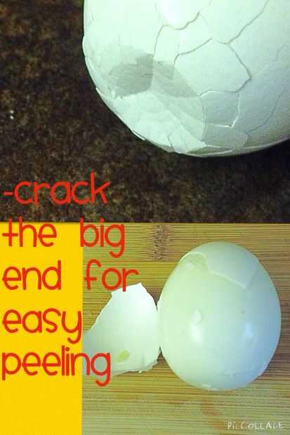 Romper los huevos en el gran final. Hay un pequeño bolsillo de aire hay que le ayudará a empezar a pelar la cáscara. Debe venir lejos fácilmente si lo haces rápidamente, mientras que el huevo esté todavía caliente.