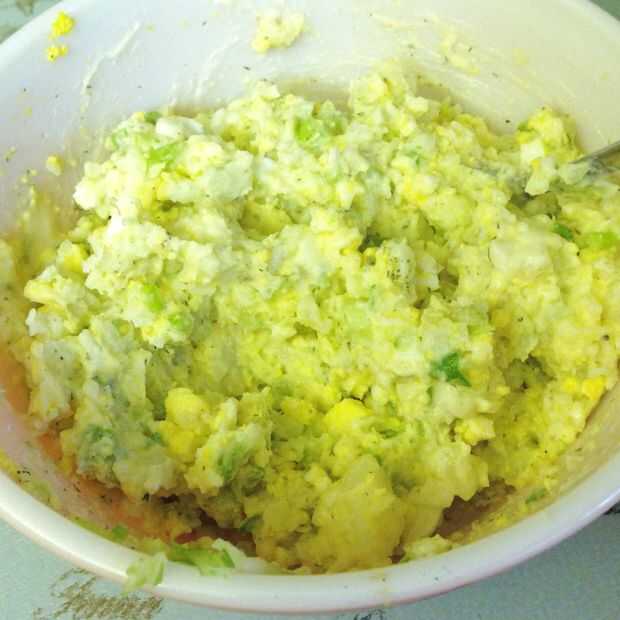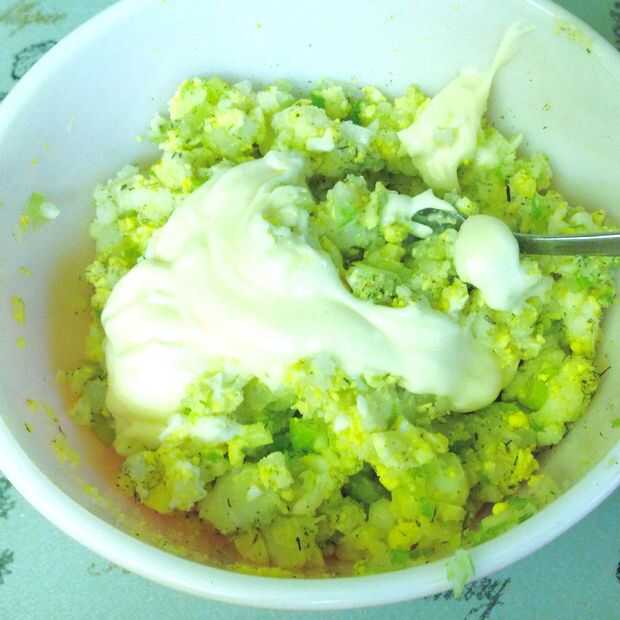 Añadir aproximadamente la mitad de una taza de mayonesa o Miracle Whip, o lo que te gusta vestir. Mi madre siempre usa Miracle Whip, por lo es lo que uso. Estaba un poco seca así que añadido aproximadamente 3 cucharadas más.