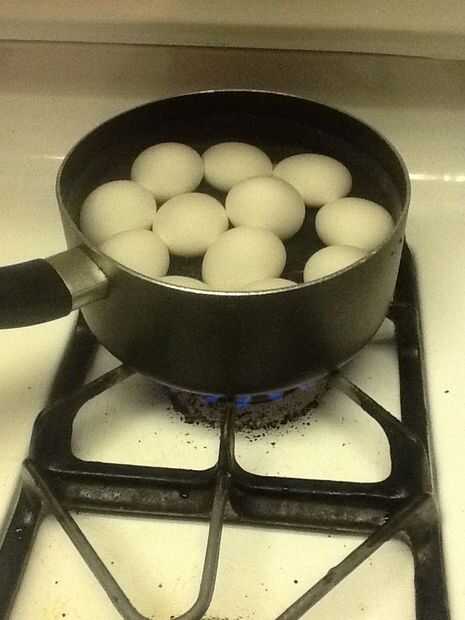 El siguiente paso es con los huevos. Abra la caja de huevos cuidadosamente la cantidad de huevos necesarios y poner en una olla muy cuidadosamente ya que son delicados. Luego poner agua limpia en el recipiente con los huevos. Después de eso poner la olla sobre el fuego durante 10-15 minutos.