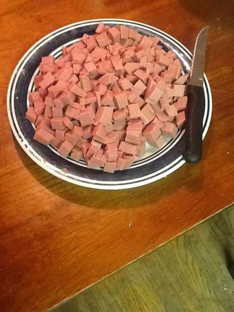 no es bonito mirar, pero esta ensalada deliciosa servido con rebanadas jamón o cualquier cena para esa materia. Es el gruesas verduras que tan buen sabor.  También añado aderezo Miracle Whip ensalada, Mayo y mostaza para una gran mezcla de sabor.Paso