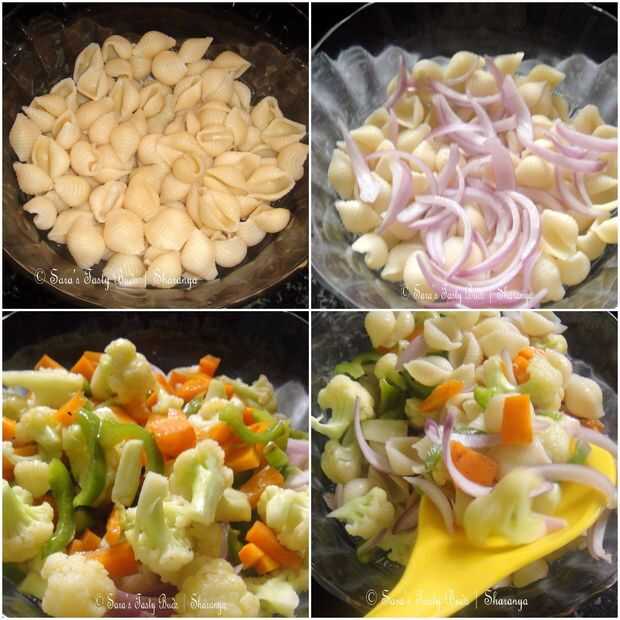 Una simple, sana, ensalada de pasta sabrosa con mantequilla tostada de pollo y un montón de crujientes verduras frescas en un yogurt cremoso light aderezo sazonado con hierbas italianas es una refrescante ensalada que es cotizada.Sirve : 2 a 3 person