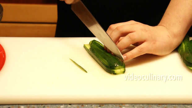 Cortar los pepinos en 3 mm (1/8 de pulgada) rodajas largo.