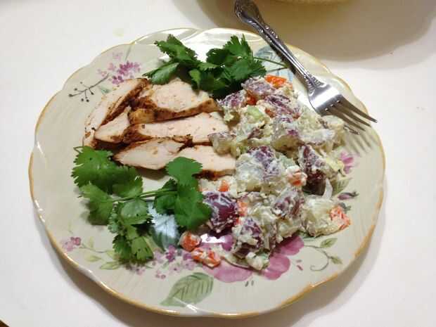 Aquí hemos servido a la "roja y pimiento dulce ensalada de papa" con algunas rodajas de pechuga de pollo BBQ y algunos pedazos de cilantro. Cilantro no sólo es bueno para el alimento de sabor, pero también es bueno para la digestión.