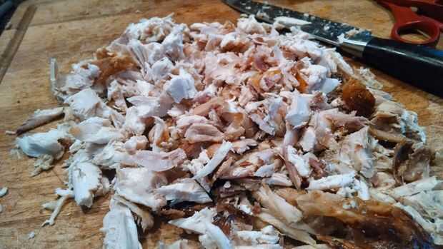 En primer lugar preparar el pollo sobrante. Para ello, quitar el hueso, luego con un cuchillo grande que sirven para desmenuzar finamente.