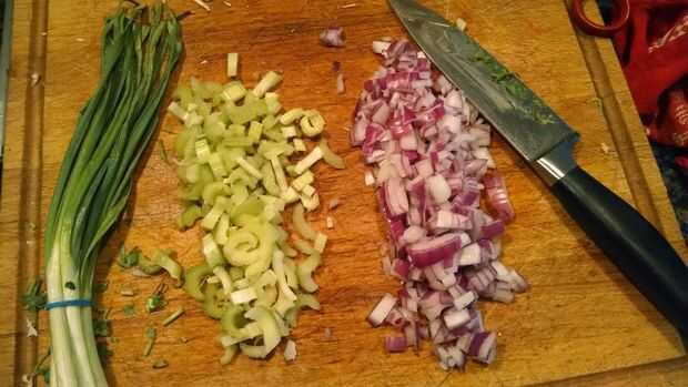 A continuación preparar verduras.  Dados encima de cebolla roja, apio, cebolla y cilantro.  Ponga a un lado.  Luego tomar un aguacate sacarlo de la cáscara y se mezclan con el cilantro hasta que quede suave.