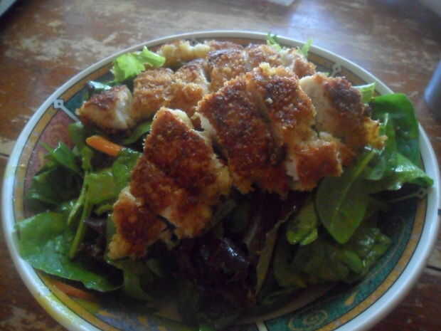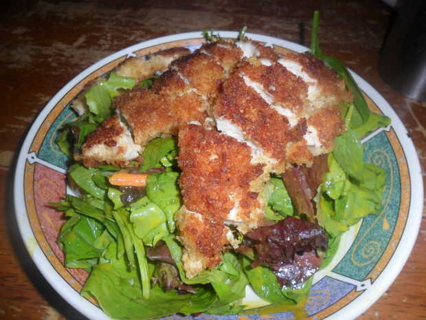 Cruce el pollo en el huevo entonces hizo una mezcla de empanado con panko, queso parmesano, sazonado sal y pimienta. Luego cociné la milanesa de pollo en un poco de aceite. Para la ensalada sólo hizo una preparación rápida con partes iguales de miel y mostaza y había sacudido la ensalada el aderezo. Fue delicioso, me gustaría que había hecho un i'ble de ella.