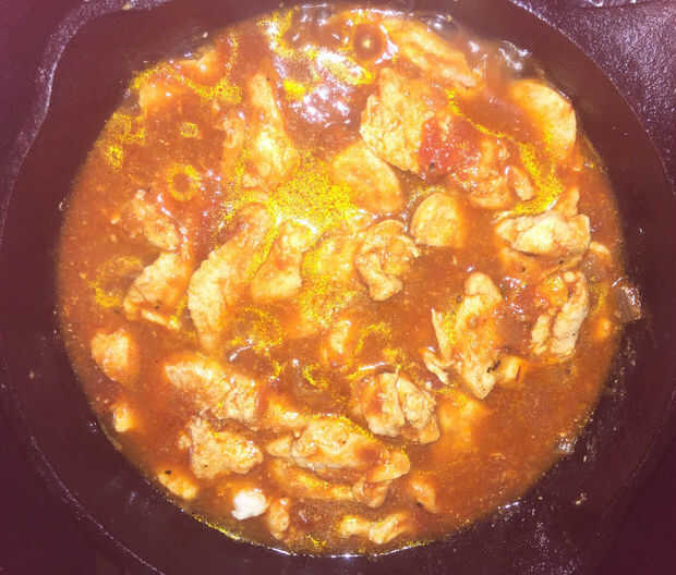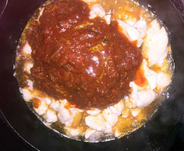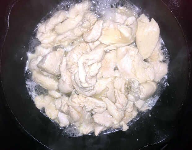 3. cocinar 3/4 cuartas partes de la pechuga de pollo y añadir salsa de la sartén de Taco para el tiempo de cocción restante.
