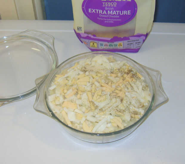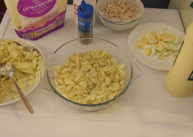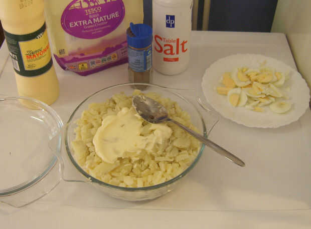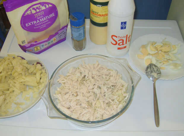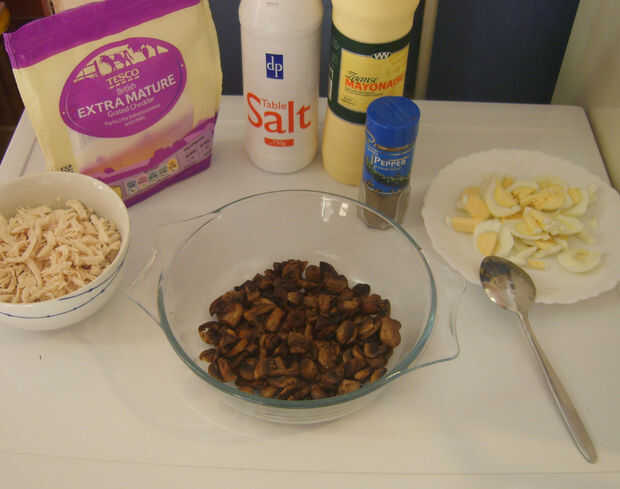Take a clean bowl. Poner en los sartén champiñones como primera capa y extendido de mayo en la parte superior. Luego espolvorear algunos pollo sobre ella y extendió otra vez mayo más en la parte superior (mayo de propagación después de cada capa de fino). Después de poner pollo y mayo, poner unas patatas en la parte superior y agregue sal y pimienta. Repetir una vez más (más setas, pollo y patatas). Como toque final, extender la mayo uniformemente en la última capa de papas y espolvorear con queso rallado y finalmente cortar huevos. Añadir un poco de sal y pimienta.