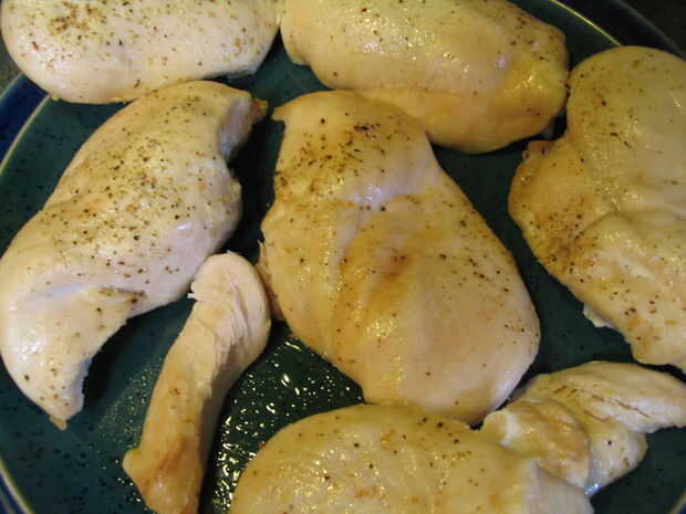 Tenía un número de pechugas de pollo en mano, por lo que rociar una sartén con aceite de canola, agregó mi pollo, cubre las piezas con pimienta (que da vuelta para asegurar cobertura completa) entonces les cocinan a 350F hasta que acaba de comenzar el giro dorado en la parte superior. Asegúrese de que los jugos salgan limpios cuando usted corta en la mitad de las piezas gruesas. Si eres daltónico Asegúrese de que tienes a un asistente en mano que puede decir la diferencia entre jugos de color de rosa y claras. Rosa es cocer; es demasiado seco. Queremos que el medio feliz.